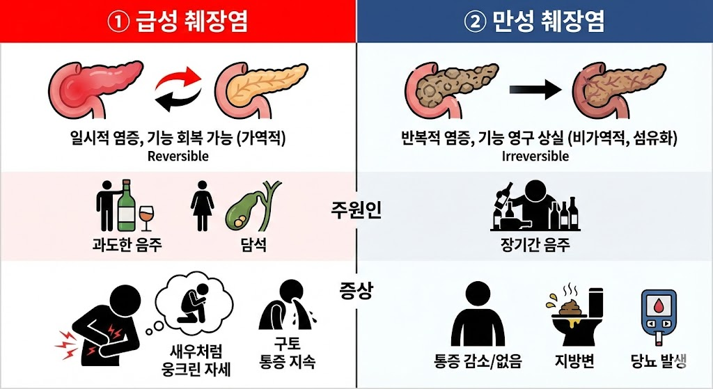 췌장은 단백질과 지방을 녹이는 아주 강력한 소화 효소(췌장액)를 만듭니다, 정상적이라면 이 효소는 안전장치가 걸려 있다가, 십이지장(소장)으로 넘어가서 음식물을 만나야 활성화됩니다, 그런데 술이나 담석 때문에 췌장액이 나가는 길이 막히거나, 췌장 세포가 손상을 입으면? 안전장치가 췌장 안에서 풀려버립니다, 강력한 소화 효소가 음식물이 아닌, 췌장 그 자체와 주변 장기를 녹이기 시작합니다, 생살이 녹아내리니 그 통증이 어마어마한 것입니다.