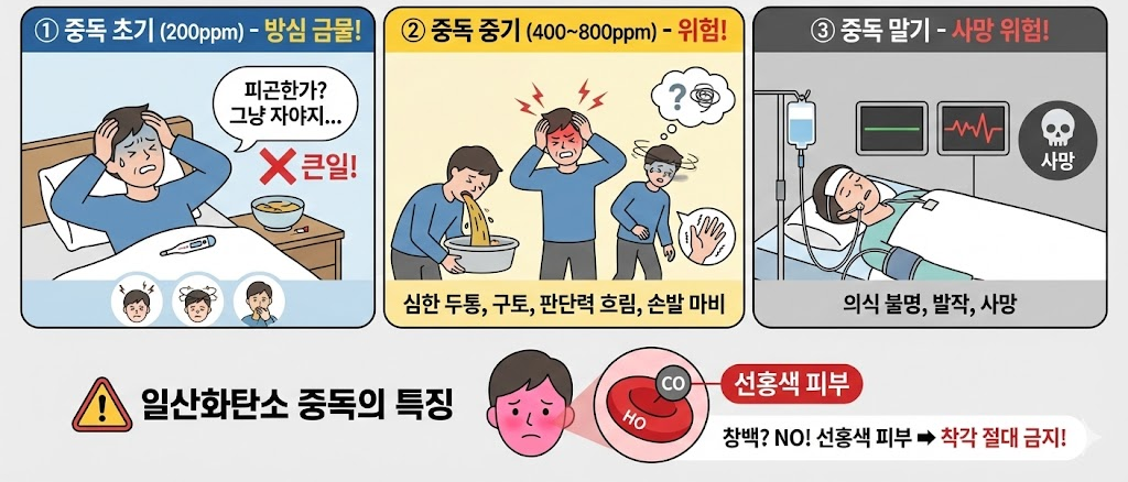 일산화탄소 중독이 무서운 건, 초기 증상이 감기나 체기와 너무 비슷해서 방심하다가 잠들어버린다는 점입니다.