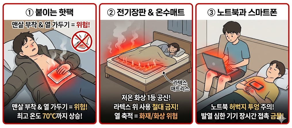 - 겨울철의 필수품이지만, 저온 화상의 1등 공신입니다, 특히 라텍스 매트리스 위에 전기장판을 깔면 열이 축적되어 화재의 위험뿐만 아니라 심각한 저온 화상을 유발할 수 있습니다.