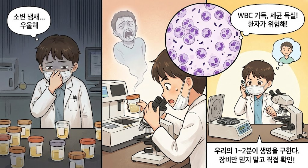 바로, 담당 선생님께 보고 드렸고, 다행히 전문의 선생님의 빠른 처치가 이루어졌다는 얘기를 들었습니다, 그때 깨달았죠, 우리가 다루는 이 노란 액체가 단순히 더러운 배설물이 아니라, 환자가 지금 어디가 아픈지 소리 없는 비명을 지르고 있는 단서라는 것을요, 냄새가 나고 귀찮아도, 우리가 꼼꼼히 봐주는 검사시간인 1~2분이 환자를 건강하게 되돌릴 수 있다는 사실을요, 장비만 믿지 마시고, 이상하다 싶으면 꼭 요검체를 원심분리기에 돌려 현미경으로 직접 확인하고 이상함을 잡아낼 수 있는 능력을 키워야 된다는 것을요!