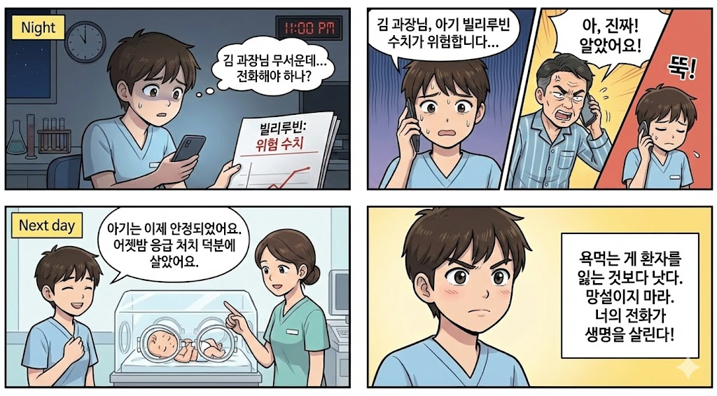 신규 때 산부인과 병원에서 근무 시절의 에피소드입니다, 밤 11시, 신생아실 아기 빌리루빈 수치가 교환수혈을 해야 할 만큼 위험한 수치가 나왔습니다, 주치의 선생님이 무섭기로 소문난 분이라 10분 정도를 망설이다 전화를 걸었죠.