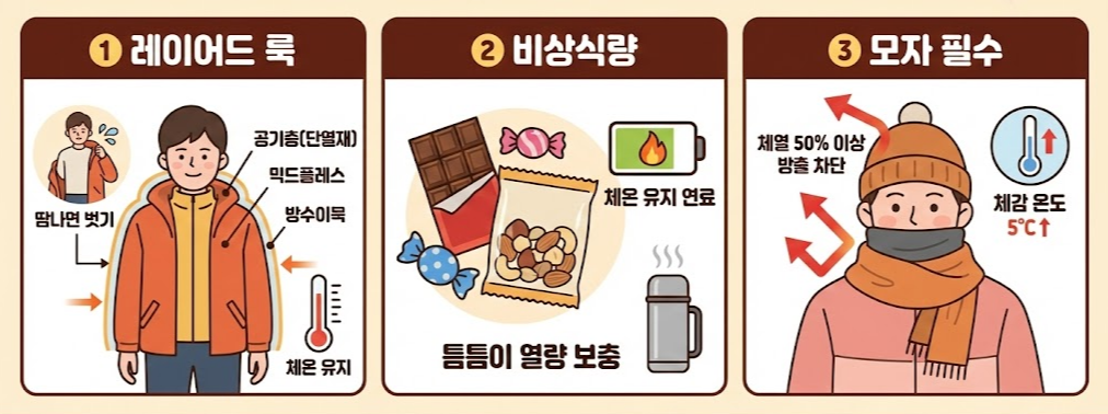 - 레이어드 룩 : 두꺼운 옷 하나보다 얇은 옷을 여러 겹 입어 공기층(단열재)을 만드세요, 땀이 나면 즉시 벗어 체온을 뺏기지 않게 조절해야 합니다.