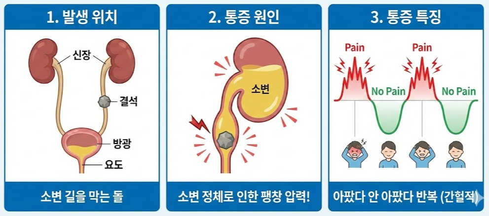 - 왜 아플까? : 돌 자체가 찌르는 통증도 있지만, 더 큰 이유는 압력입니다, 돌이 요관을 막으면, 신장에서 만들어진 소변이 내려가지 못하고 꽉 차오르면서 요관과 신장이 풍선처럼 팽창합니다, 이때 느끼는 내부 압력이 엄청난 통증을 유발하는 거죠.
