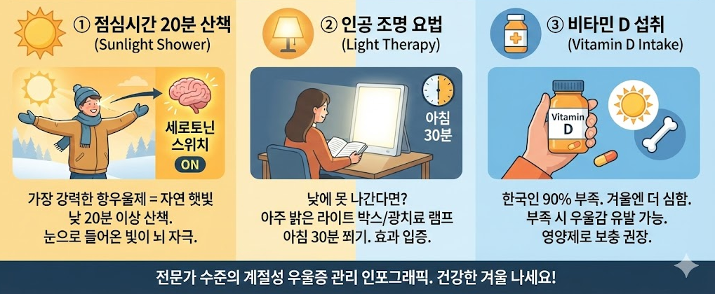 "어차피 3월이 되면 좋아질 텐데 뭐." 하고 버티시는 분들 계시죠? 하지만 겨울은 3개월이나 지속됩니다. 1년의 1/4을 무기력하게 날려버리는 것은 삶의 질에 너무 큰 손해입니다.