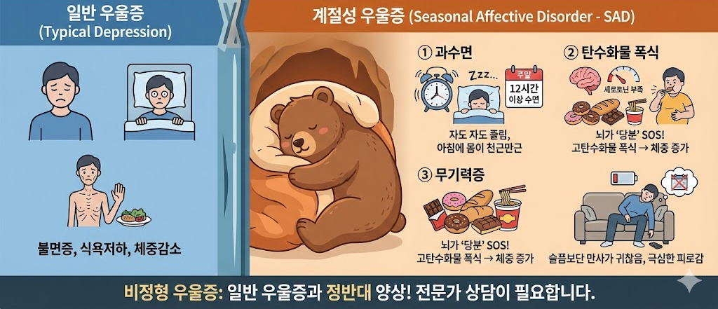 이게 바로 계절성 우울증의 가장 큰 특징이죠, 일반적인 우울증(불면증, 식욕저하)과 정반대의 양상을 보이기 때문에 비정형 우울증 이라고도 부릅니다.