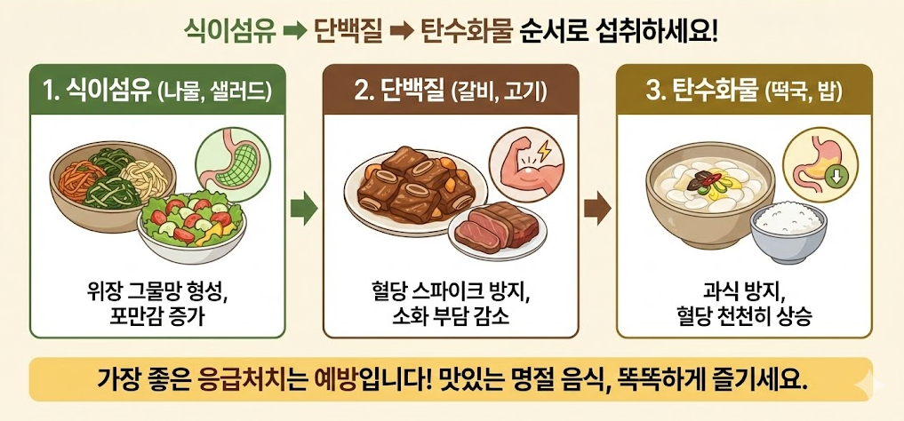 - 식이섬유 ➡ 단백질 ➡ 탄수화물 순서로 섭취하세요. 나물 반찬이나 샐러드(식이섬유)를 먼저 씹어 먹으면, 위장에 촘촘한 그물망이 쳐집니다. 그다음 갈비(단백질)를 먹고, 떡국이나 밥(탄수화물)을 가장 마지막에 드세요, 포만감이 빨리 와서 과식을 막아주고, 혈당이 천천히 올라 위장의 부담을 확 줄여줍니다.