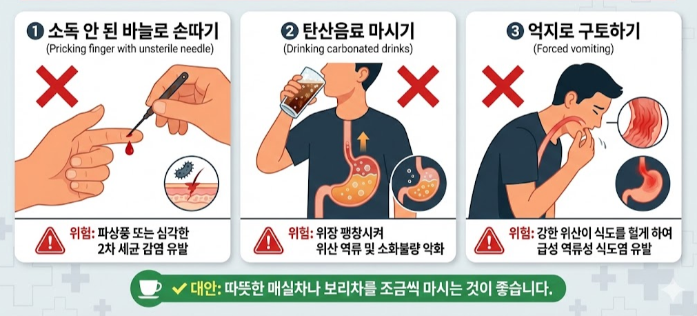 - 소독 안 된 바늘로 손 따기 : 속이 꽉 막힌 느낌에 바늘로 손가락을 따는 분들 많으시죠? 심리적 효과는 있을지 몰라도, 소독되지 않은 바늘을 사용하면 파상풍 또는 심각한 2차 세균 감염을 일으킬 수 있어 의학적으로는 절대 권장하지 않는 방법입니다.