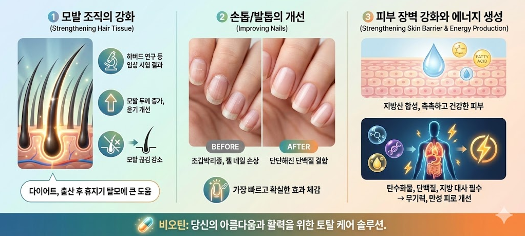 - 우리 머리카락과 손톱의 80~90%는 케라틴이라는 단백질로 이루어져 있습니다, 비오틴은 바로 이 단백질 대사에 없어서는 안 될 조효소 역할을 합니다. 쉽게 비유하자면, 머리카락이 벽돌집이라면, 비오틴은 그 벽돌들이 무너지지 않게 단단히 붙여주는 시멘트 역할을 하는 겁니다. 비오틴이 부족하면 시멘트가 부실한 벽돌집처럼 머리카락이 가늘어지고, 힘없이 뚝뚝 끊어지며, 손톱이 겹겹이 갈라지는 현상이 나타나는 것이죠.