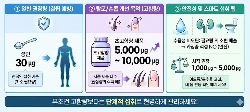- 탈모/ 손톱 개선의 목적 : 시중에 나오는 제품들은 보통 5,000 ㎍ ~ 10,000 ㎍ 의 초고함량 제품이 많습니다, 권장량의 수백 배라 걱정되시나요? 특히 비오틴은 수용성이라 몸에서 필요한 만큼만 쓰고 남은 건 소변으로 배출됩니다. 따라서 과잉증 걱정은 거의 없는 안전한 영양소죠, 다만 앞서 말씀드린 여드름 문제나 흡수율을 고려했을 때 무조건 10,000 ㎍ 보다는 1,000 ㎍ ~ 5,000 ㎍ 정도부터 시작해서 내 몸의 반응을 보는 것이 현명합니다.