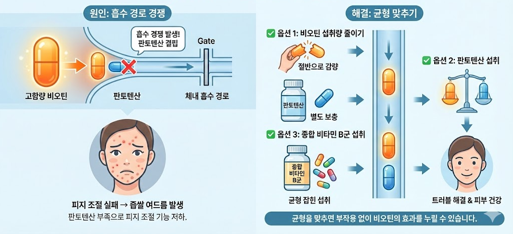 - 원인 : 비오틴은 판토텐산(비타민 B5)이라는 성분과 몸속의 흡수 경로가 같습니다. 비오틴을 갑자기 엄청 많이 복용하게 되면, 상대적으로 판토텐산이 흡수되지 못해 결핍이 생깁니다. 판토텐산은 피지를 조절하는 역할을 하는데, 이게 부족해지니 피지가 폭발하고 여드름이 나는 것이죠.