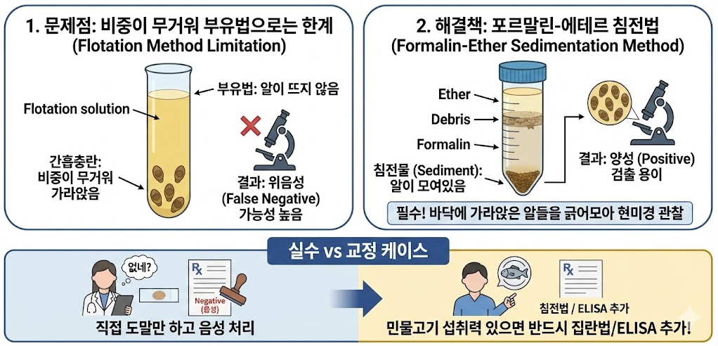 - 교정 케이스 : 감염량이 적을 땐 도말에서 잘 나오지 않습니다. 민물고기 섭취력이 있다면 반드시 집란 법을 돌리거나, 혈청학적 검사인 ELISA 검사를 추가 처방받을 수 있게 보고합니다.