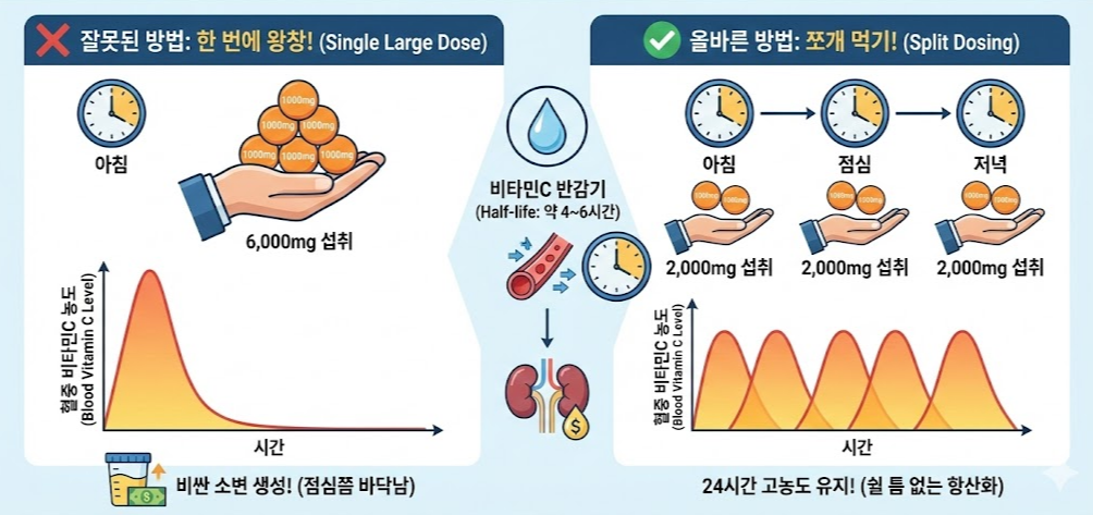 - 비타민C의 반감기 (약 4~6시간) : 비타민C는 물에 아주 잘 녹는 수용성입니다. 우리 몸에 들어오면 혈중 비타민C 농도가 급격히 팍! 올라가지만, 혈관을 타고 돌며 항산화 작용을 마친 뒤 약 4~6시간이 지나면 소변으로 싹 다 빠져나가 버립니다. (이걸 반감기라고 합니다.)
