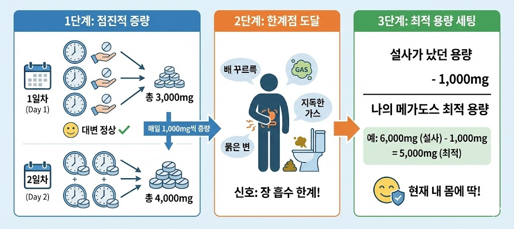 - 최적 용량 세팅 : 설사가 났던 용량에서 1,000mg을 뺀 용량이 현재 내 몸에 딱 맞는 메가도스 최적 용량입니다. 만약 6,000mg에서 설사를 했다면, 내 한계량은 하루 5,000mg인 거죠.