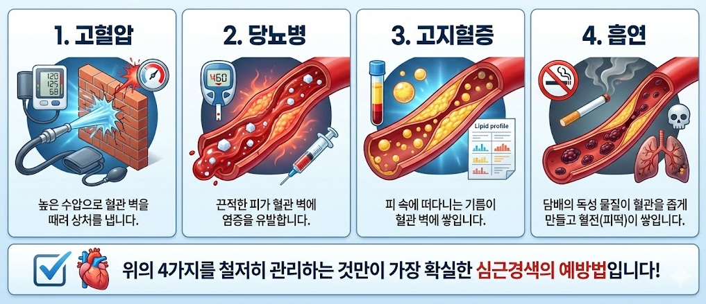 심근경색은 어느 날 갑자기 오는 질병이 아닙니다, 수십 년간 내 혈관에 쓰레기를 버려온 결과물인 거죠, 혈관을 병들게 하는 4대 악당은 다음과 같습니다.