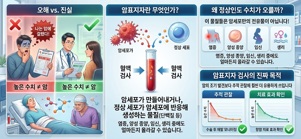 가장 먼저 짚고 넘어가야 할 명제가 있습니다. "암표지자 수치가 높다 = 암에 걸렸다"는 절대 성립하지 않습니다.