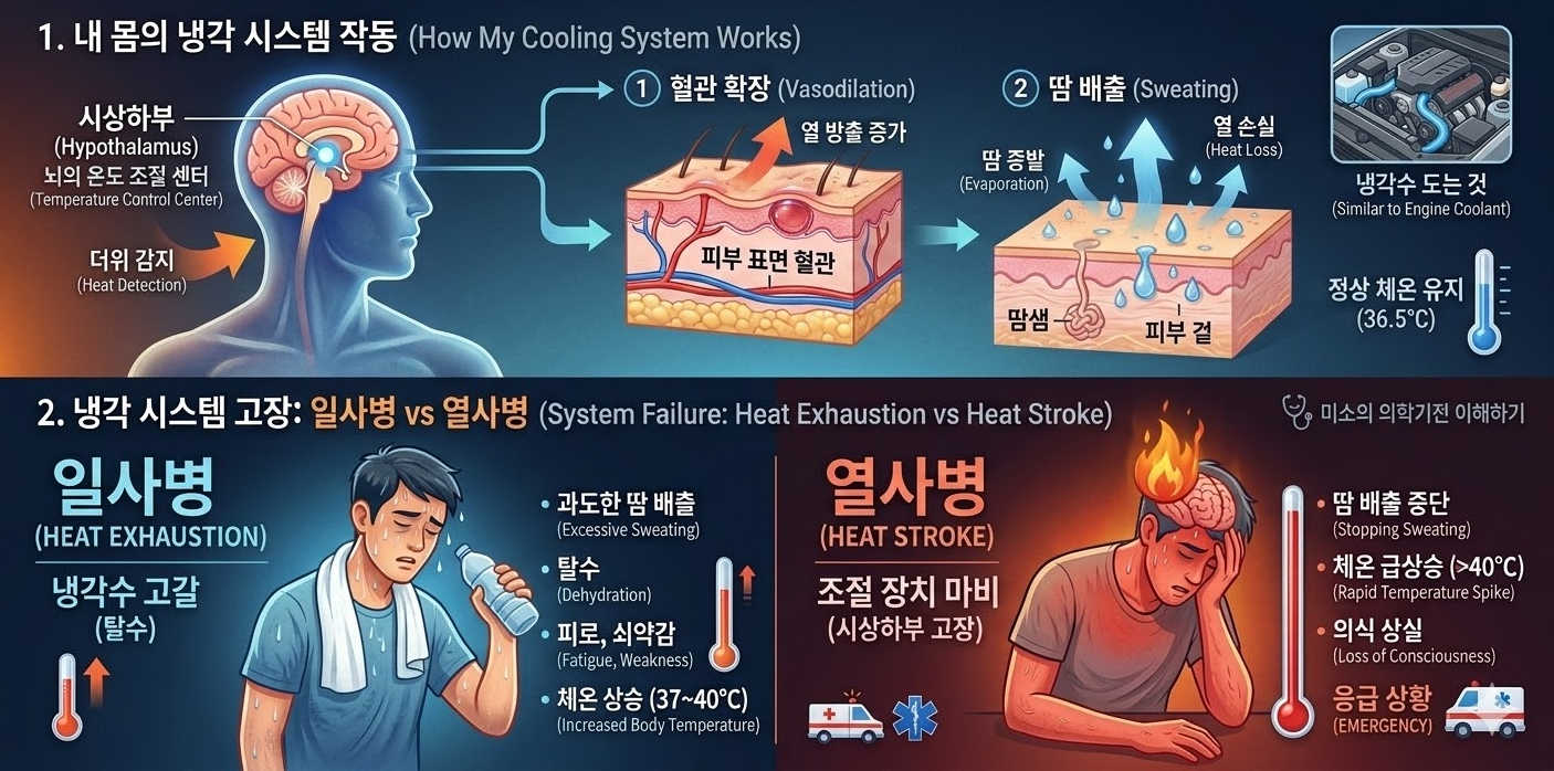 - 우리 몸은 36.5도를 유지해야만 생존할 수 있습니다. 한여름 뙤약볕에 체온이 올라가면, 뇌의 온도 조절센터와도 같은 시상하부는 피부 표면의 혈관을 넓히고 땀을 배출하라는 명령을 내립니다. 이 땀이 피부 겉에서 증발하면서 열을 빼앗아 가고, 우리는 정상 체온을 유지하게 됩니다. 마치 자동차 엔진이 과열되지 않게 냉각수가 도는 것과 같은 이치죠. 그런데 이 냉각수가 바닥나거나, 아예 엔진 조절 장치가 고장 나버리면 어떻게 될까요? 여기서 일사병과 열사병의 차이가 갈라집니다.