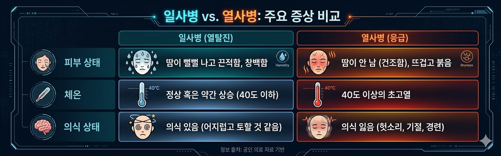 - 원인 : 뇌의 온도 조절 센터 자체가 더위를 견디지 못하고 완전히 파업해 버린 상태입니다.