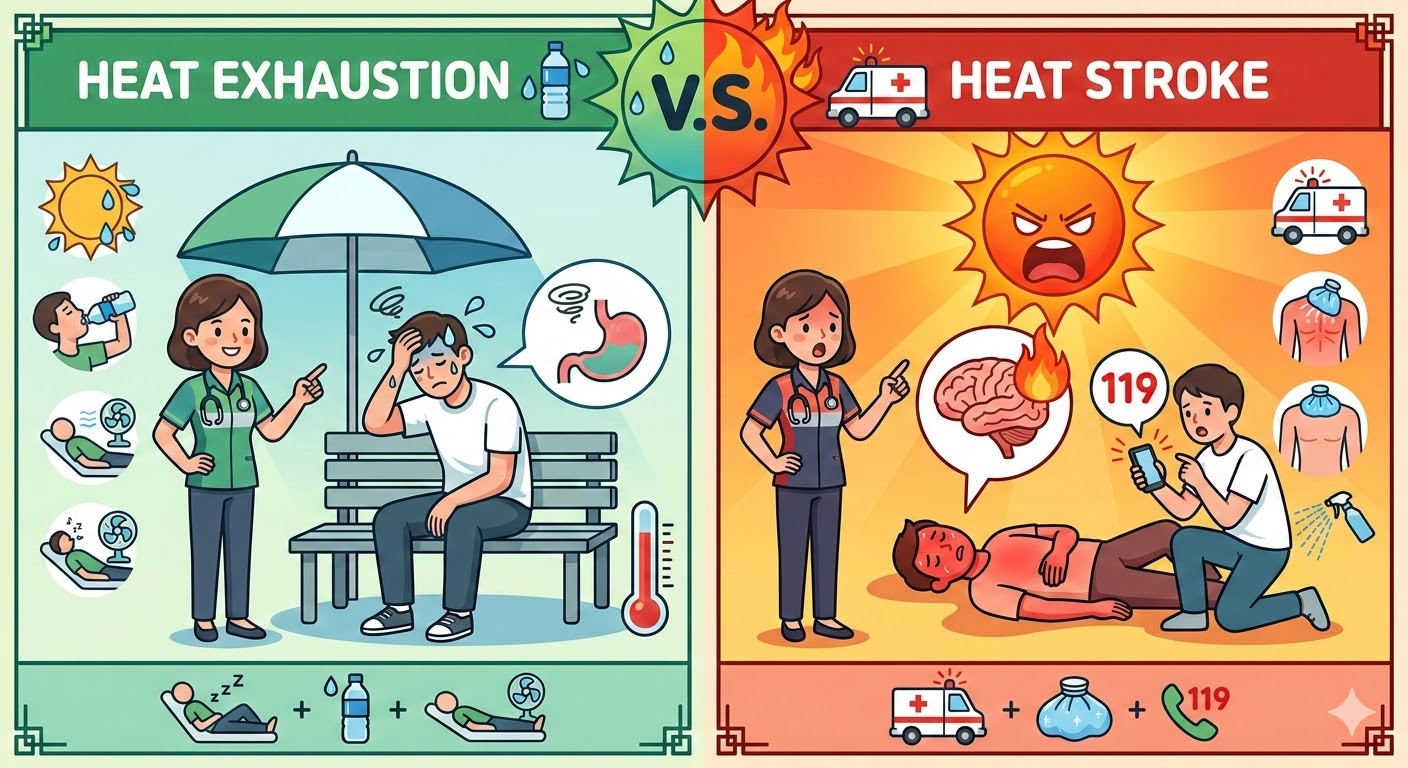 푹푹 찌는 한여름, 야외에서 일하거나 신나게 휴가를 즐기다 갑자기 눈앞이 핑 돌고 주저앉아 본 경험 있으신가요? 흔히 우리는 이런 증상을 더위 먹었다고 표현하는데요, 약국에 가서 피로회복제를 사 드시거나 그늘에서 쉬면 괜찮아지는 경우도 있지만, 만약 곁에 있던 사람이 의식을 잃고 쓰러졌는데 피부가 불덩이처럼 뜨겁고 땀이 나지 않는다면 그건 단순한 더위가 아닙니다. 119를 부르지 않으면 뇌가 손상되어 사망에 이를 수 있는 초응급 상황인 거죠. 우리의 목숨을 앗아갈 수도 있는 여름철 두 가지 킬러, 일사병(Heat Exhausion)과 열사병(Heat Stroke) 이름은 비슷하지만, 우리 몸속에서 벌어지는 일은 완전히 다릅니다. 오늘은 미소가 이 두 가지 온열질환의 결정적 차이점과, 내 가족을 살리는 올바른 생존 응급처치법을 명쾌하게 비교해 드립니다.