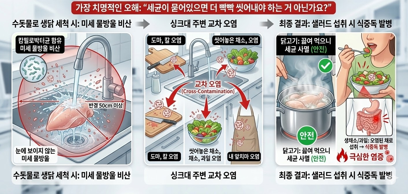 수돗물을 틀어놓고 생닭을 씻을 때, 물이 사방으로 튀는 것을 보신 적 있죠? 눈에 보이지 않는 미세한 물방울들은 반경 50cm 이상 사방으로 날아갑니다. 이때 생닭 표면에 있던 캄필로박터균이 물방울을 타고 싱크대 주변에 놓인 도마, 칼 씻어놓은 채소, 과일, 심지어 내 앞치마에까지 고스란히 옮겨 붙게 됩니다. 이것을 의학 용어로 교차 오염이라고 부릅니다. 닭고기 자체는 펄펄 끓여 먹으니 세균이 죽지만, 균이 튄 생채소를 샐러드로 무쳐 먹으면서 고스란히 세균을 섭취하게 되는 것입니다.