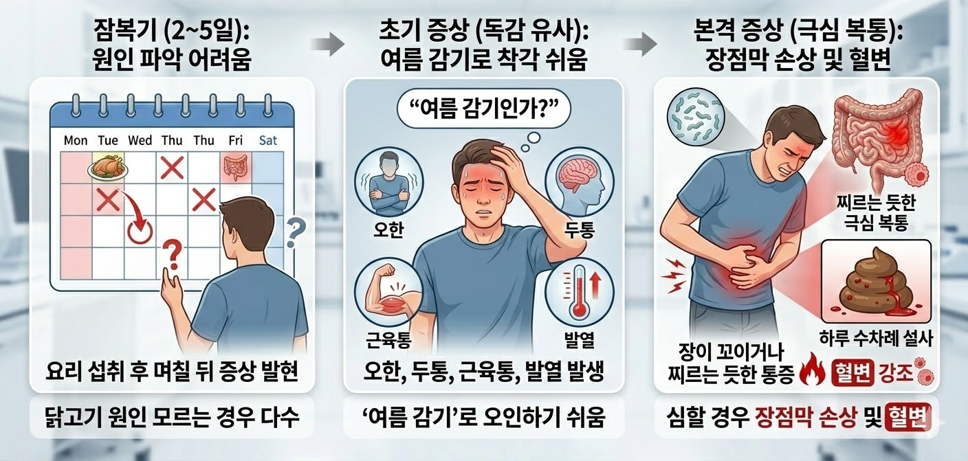 - 잠복기 (2~5일) : 요리를 먹고 며칠이 지난 후에 증상이 나타나기 때문에, 원인이 닭고기라는 사실을 눈치채지 못하는 경우가 많습니다.