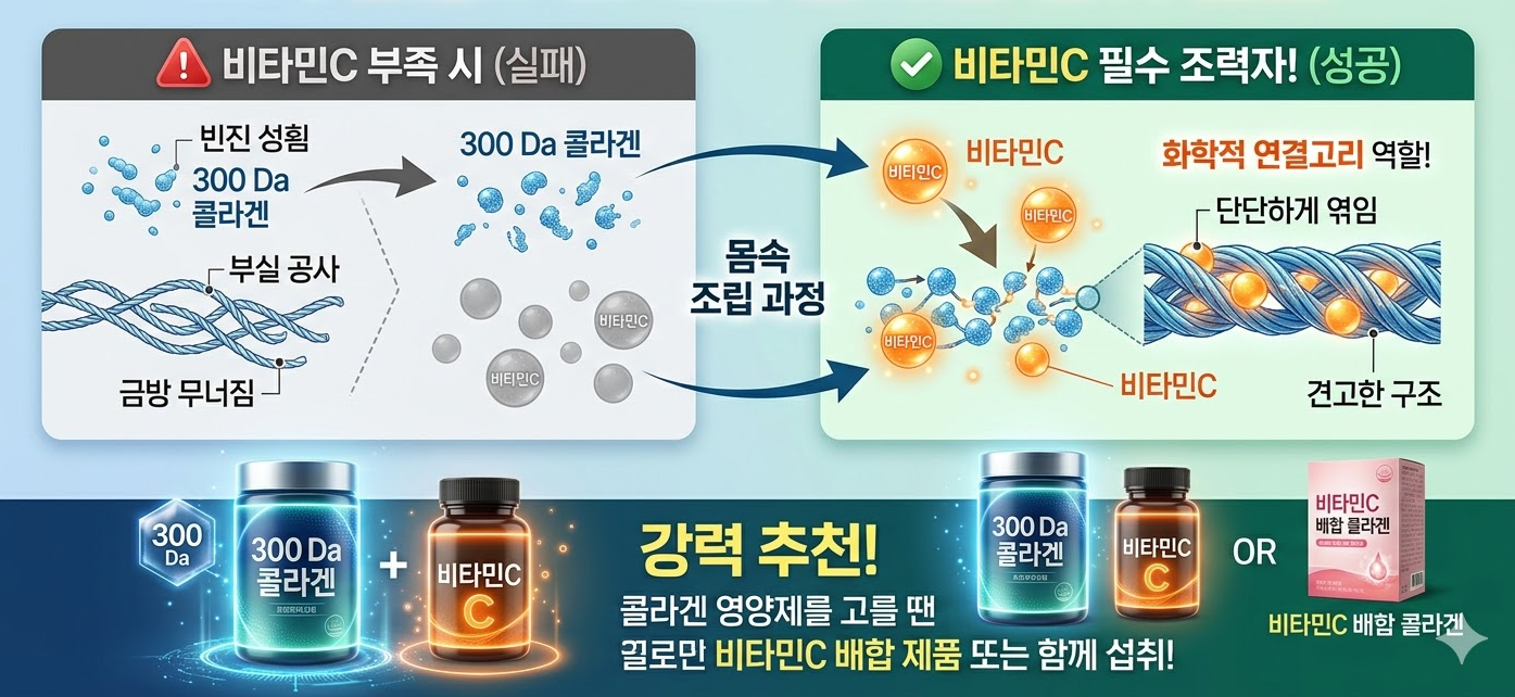 아무리 작게 쪼갠 300 달톤 콜라겐을 먹어도, 몸속에서 제대로 조립되지 않으면 아무 소용이 없습니다. 이때 반드시 필요한 조력자가 바로 비타민C입니다.