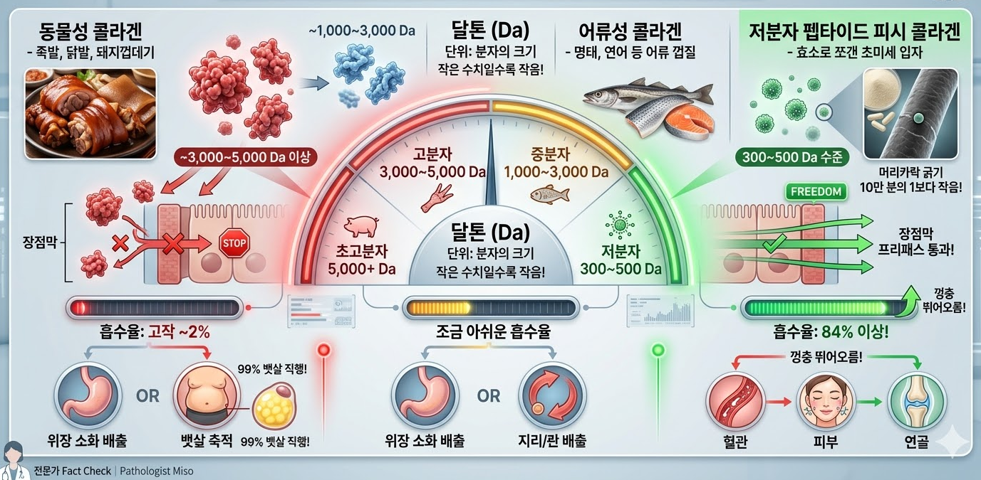 - 동물성 콜라겐 (족발, 닭발, 돼지껍데기) : 약3,000~5,000 달톤 이상의 아주 거대한 고분자입니다. 우리 장점막을 통과하기엔 너무 커서 흡수율이 고작 2% 정도에 불과하죠. 나머지는 그냥 위장에서 소화되어 배출되거나 살이 될 뿐입니다.