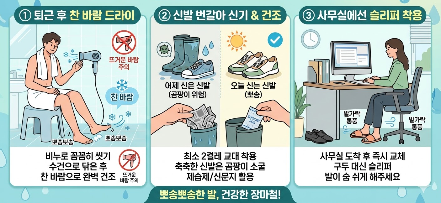 - 비에 젖은 발을 비누로 꼼꼼히 씻는 것은 기본입니다. 중요한 건 그다음이죠, 수건으로 물기를 닦은 후, 드라이기의 찬 바람을 이용해 발가락 사이사이를 뽀송뽀송해질 때까지 완벽하게 말려주세요. 뜨거운 바람은 피부를 자극하므로 피하세요!