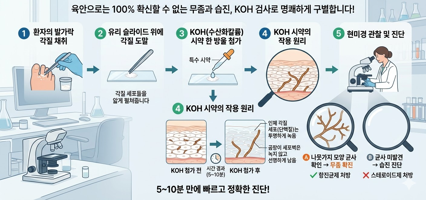 쌍둥이 같은 두 질환을 병원에서는 어떻게 구별할까요? 육안으로만 봐서는 전문가들도 100% 확신하기 힘듭니다. 그래서 피부과에 가시면 의사 선생님이 발가락의 하얀 각질을 긁어내서 진단검사실로 보냅니다. 여기서 바로 임상병리사들의 전공인 KOH 도말 검사 즉, 수산화칼륨 도말 검사를 시작하는 거죠!