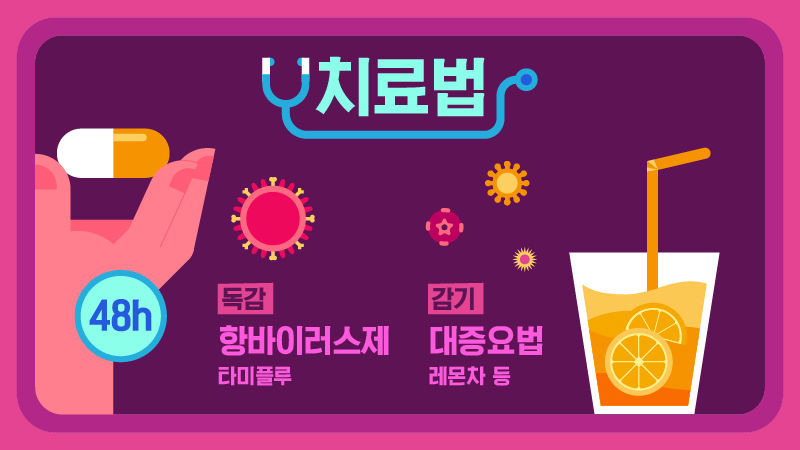 독감 확진을 받았다면, 이제 치료를 해야겠죠? 여기서 가장 중요한 건 시간입니다, 독감 바이러스는 몸에 들어와, 보통 48시간 내에 폭발적으로 증식합니다, 그래서 증상 발현 후 48시간 이내에 항바이러스제(타미플루, 페라미플루 등)를 투여해야 바이러스 증식을 막고 증상을 빠르게 완화시킬 수 있어요.