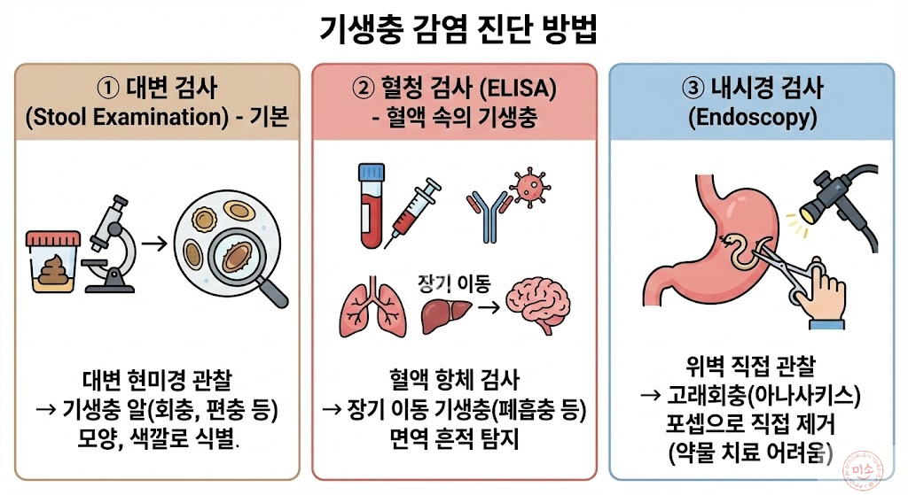 - 검사원리: 장 속에 사는 기생충(회충, 편충, 간흡충 등)은 대변으로 알을 낳습니다, 임상병리사들은 이 알의 모양, 껍질 두께, 색깔 등을 보고 기생충을 찾아냅니다.