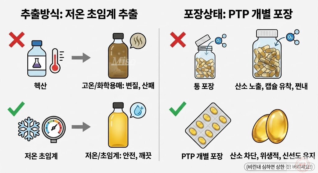 - 추출방식을 확인(초임계추출): 기름은 열에 약합니다, 헥산 같은 화학 용매를 쓰거나 높은 열을 가하면 변질될 수 있죠, 저온에서 추출한 " 저온 초임계 추출 " 방식이 안전하고 깨끗합니다.