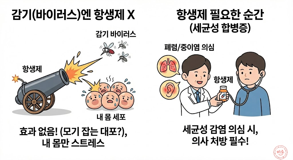 이제 왜 감기에 항생제를 안 쓰는지 이해되시나요?, 감기의 원인은 90% 이상이 바이러스(리노바이러스 등)이기 때문입니다, 항생제는 세균의 세포벽을 터뜨리거나 세균의 단백질 합성을 방해해서 죽이는 약입니다, 그런데 바이러스는 세포벽도 없고, 우리 몸의 세포 속에 숨어있습니다, 즉 바이러스성 감기에 항생제를 먹는 건, 모기를 잡겠다고 대포를 쏘는 것과 같습니다, 모기(바이러스)는 안 죽고, 대포 소리에 멀쩡한 우리 몸의 세포들만 스트레스를 받는 거죠.