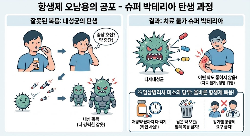 제가 오늘 이 글을 쓴 진짜 목적입니다, 항생제가 포함된 약을 먹다 보니 증상이 좀 나아졌다고 생각해서, 마음대로 약을 중단하시는 분들 정말 위험합니다, 세균은 아주 똑똑하고 독해요, 항생제 공격을 받다가 어설프게 살아남은 녀석들은 항생제 내성(Resistance)을 가지게 됩니다, 세균이 학습을 해서 다음번엔 더 강력한 갑옷을 입고 나타나는 거죠, 이게 반복되면 결국 어떤 강력한 항생제를 써도 죽지 않는 다제내성균(Super Bacteria) 이 탄생합니다, 찔렸는데 상처가 아물지 않고 염증이 계속 퍼져서 결국 생명을 잃을 수도 있는 무서운 상황이 올 수 있습니다.