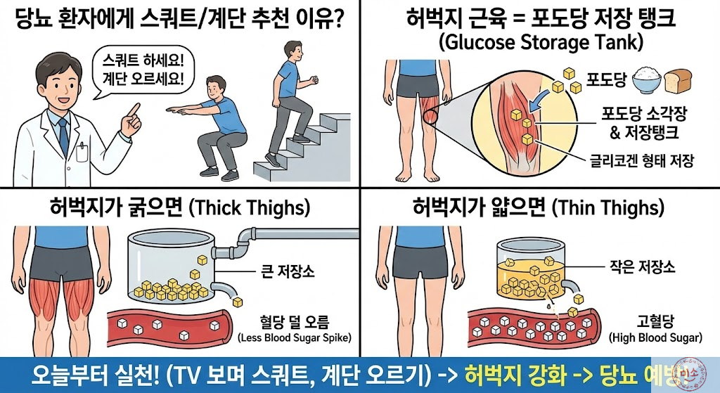 당뇨 환자에게 의사 선생님들이 스쿼트 하세요, 계단 오르세요라고 귀에 딱지가 앉도록 말하는 이유가 뭘까요?, 바로 허벅지 근육이 우리 몸에서 가장 큰 포도당 소각장 이자 설탕 저장탱크 이기 때문입니다.