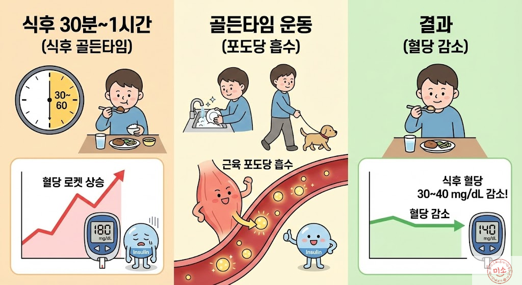 식사를 하고 아, 배부르다 하고 소파에 눕는 순간, 혈당은 로켓처럼 치솟습니다, 우리가 먹은 포도당이 혈액 속으로 가장 많이 쏟아져 나오는 시간이 보통 식사 시작 후 30분~1시간 사이거든요, 이때가 바로 골든타임입니다, 이 타이밍에 몸을 움직여 주면, 혈액 속에 넘쳐나는 포도당을 근육이 쏙쏙 빨아들여 에너지로 써버립니다, 즉, 인슐린이 힘들게 일하지 않아도 혈당이 자연스럽게 내려가는 거죠.