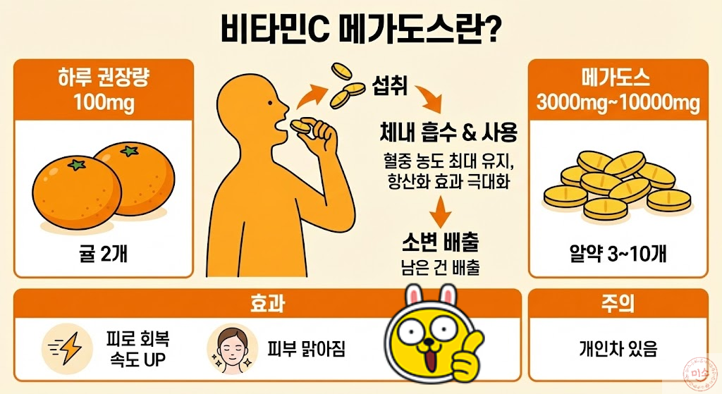 오늘은 피로 회복의 대명사, 비타민C와 메가도스 요법에 대해 알아봤습니다, 남들이 좋다고 해서 무작정 따라 하기보다는, 내 건강 상태와 위장 상태를 먼저 체크해 보세요, 건강한 성인이라면 메가도스가 활력을 주는 좋은 방법이 될 수 있지만, 결석 위험군에게는 고통의 시작이 될 수도 있으니까요, 오늘 점심 식사 후, 상큼한 비타민C 한 알과 물 한잔으로 오후의 나른함을 날려보시는 건 어떨까요?