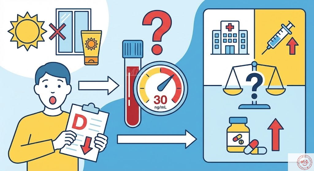 - 부족(10~30ng/mL): 한국인 대부분(90%)이 여기 속합니다, 관리가 필요합니다.