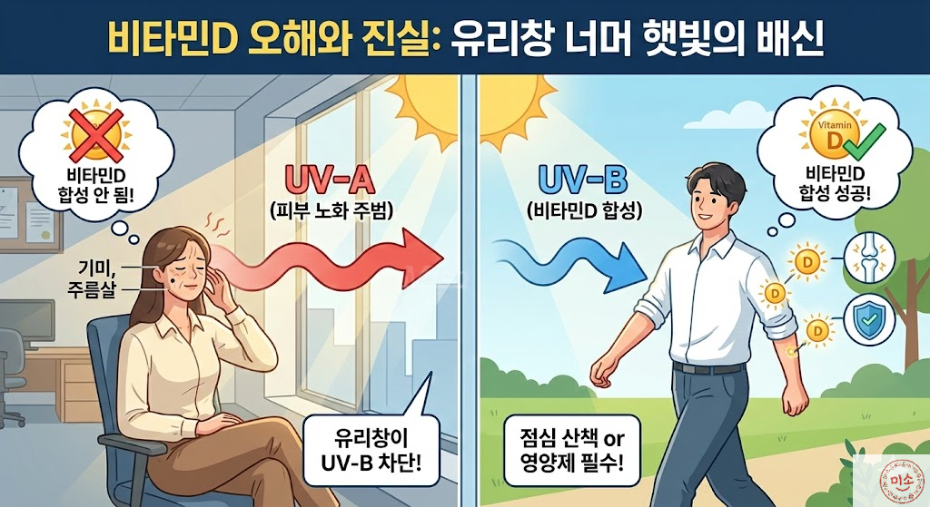 절대 아닙니다!, 비타민D를 만드는 자외선은 UV-B입니다, 이 녀석은 유리창을 통과하지 못합니다, 창가에 앉아서 따뜻함을 느끼는 건 UV-A(피부 노화의 주범) 때문이죠, 즉 유리창 너머의 햇빛은 비타민 D 합성에 1도 도움이 안 되며, 기미와 주름살만 발생시키죠, 그러니 사무실 창가에 앉아있다고 안심하지 마시고, 점심시간에 나가서 산책하시거나 영양제를 챙겨 드시는 걸 추천드려요!