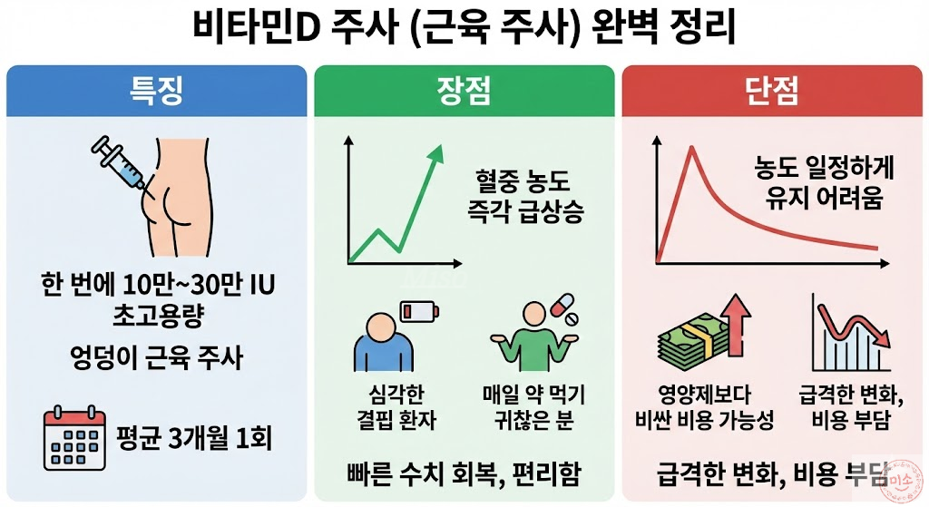 - 장점: 혈중 농도가 즉각적으로 급상승합니다, 수치가 한 자릿수인 심각한 결핍 환자나, 매일 약 챙겨 먹기 귀찮은 분들에게 최고입니다.(평균적으로 3개월에 한 번 맞습니다.)