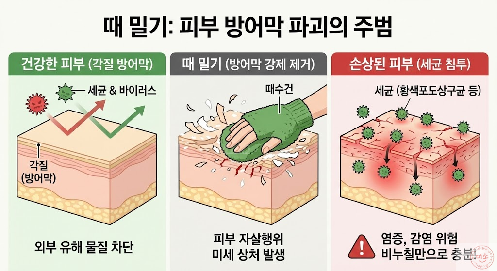 한국인의 목욕 문화에서 빼놓을 수 없는 게 바로 때 밀기 죠, 하얀 각질이 보이면 더럽다고 생각해서 뜨거운 물에 푹 불려서 때수건으로 박박 미시는 분들이 많죠, 하지만 이건 피부 자살행위나 다름없습니다.