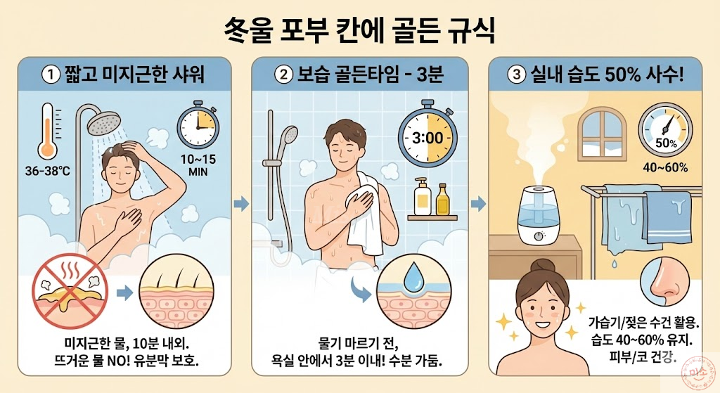 - 겨울철과 같이 건조한 계절에는 체온과 비슷한 미지근한 물로, 10~15분 이내에 샤워를 끝내세요.