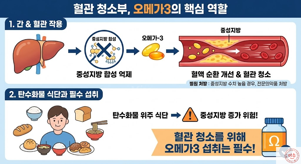 - 내 식단이 탄수화물 위주라면, 혈관 청소를 위해 오메가3 섭취는 선택이 아닌 필수입니다.