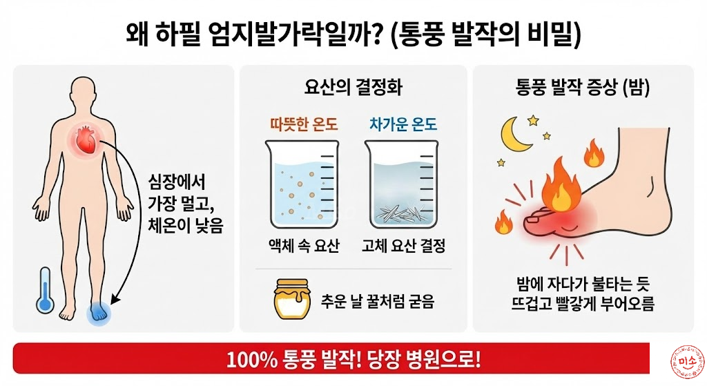 통풍 환자의 90%는 엄지발가락 뿌리 부분에서 첫 발작이 시작되죠, 이유는 간단합니다 우리 심장에서 가장 멀고, 체온이 가장 낮은 곳이기 때문입니다.