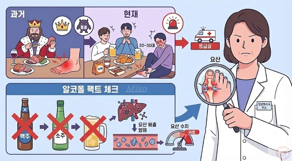 여러분, 오늘은 왕의 병이라고도 불리는 공포의 질환, 바로 통풍(Gout)에 대해 이야기하려 합니다, 예전에는 기름진 고기와 술을 즐기는 중년 남성의 병이었지만, 요즘은 회식과 배달 음식(치맥)을 즐기는 20~30대 젊은 남성들이 응급실에 실려 오는 경우가 급증하고 있습니다.