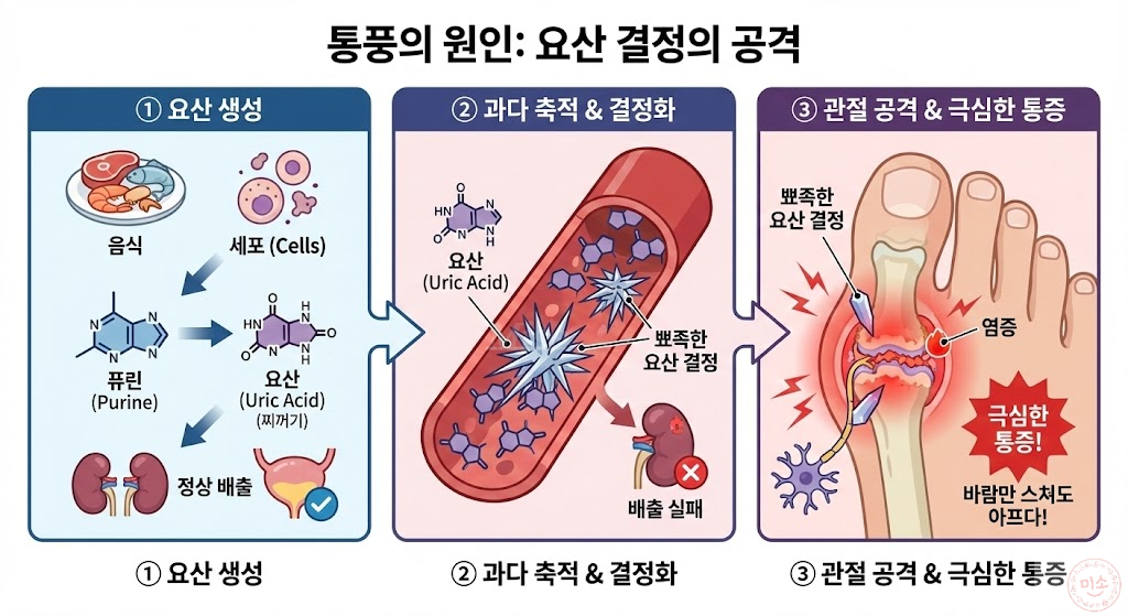 우리 몸의 세포가 죽거나 음식을 소화할 때 퓨린(Purine)이라는 물질이 분해되면서 찌꺼기가 남는데, 이게 바로 요산(Uric Acid)입니다, 보통은 소변으로 다 빠져나가야 정상입니다, 하지만 요산이 너무 많이 만들어지거나, 콩팥에서 배출을 못 하면?