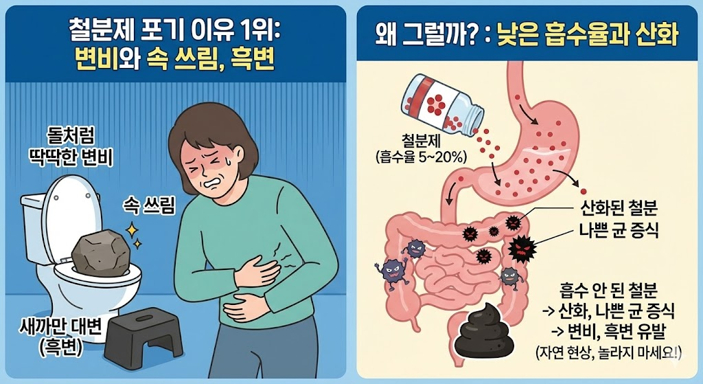 철분제를 먹다가 포기하는 이유 1위, 바로 돌처럼 딱딱해지는 변비와 속 쓰림, 그리고 새까만 대변(흑변)입니다.