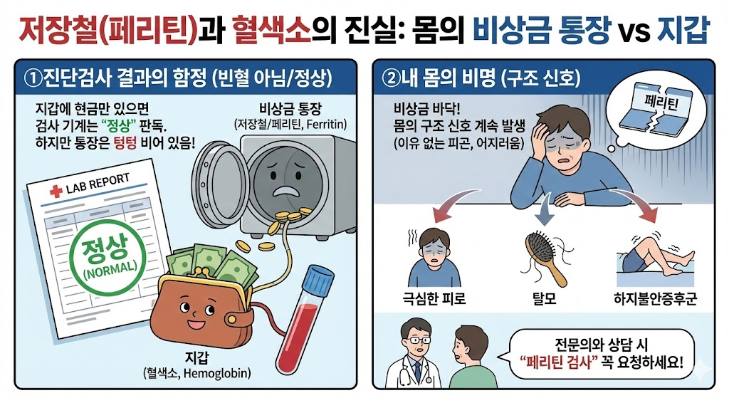 평소에 앉았다 일어날 때마다 머리가 핑 도는데, 피검사는 정상이라고 나오시는 분, 보통 여성 환자분들이 많이 호소하시는데요, 분명히 손톱도 얇아지고, 조금만 걸어도 숨이 차며 어지러움까지 동반하는데 병원 검사 결과지에는 정상이라고 나오니 정말 답답할 노릇이죠, 임상병리사 미소가 범인을 지목해 드리겠습니다, 쉽게 말씀드리면 여러분의 지갑(혈색소)에는 당장 쓸 현금이 조금 있을지 몰라도, 통장(저장철)은 이미 텅텅 비어 부도나기 직전일 수 있습니다, 의학적으로는 이것을 잠재적 철 결핍(Latent Iron Deficiency)이라고 부르죠, 오늘은 빈혈 수치는 정상인데 내 몸은 왜 이렇게 힘든 건지, 그리고 철분제만 먹으면 변비와 속 쓰림으로 고생하는 분들을 위한 현실적인 해결책까지 확실하게 말씀드릴게요