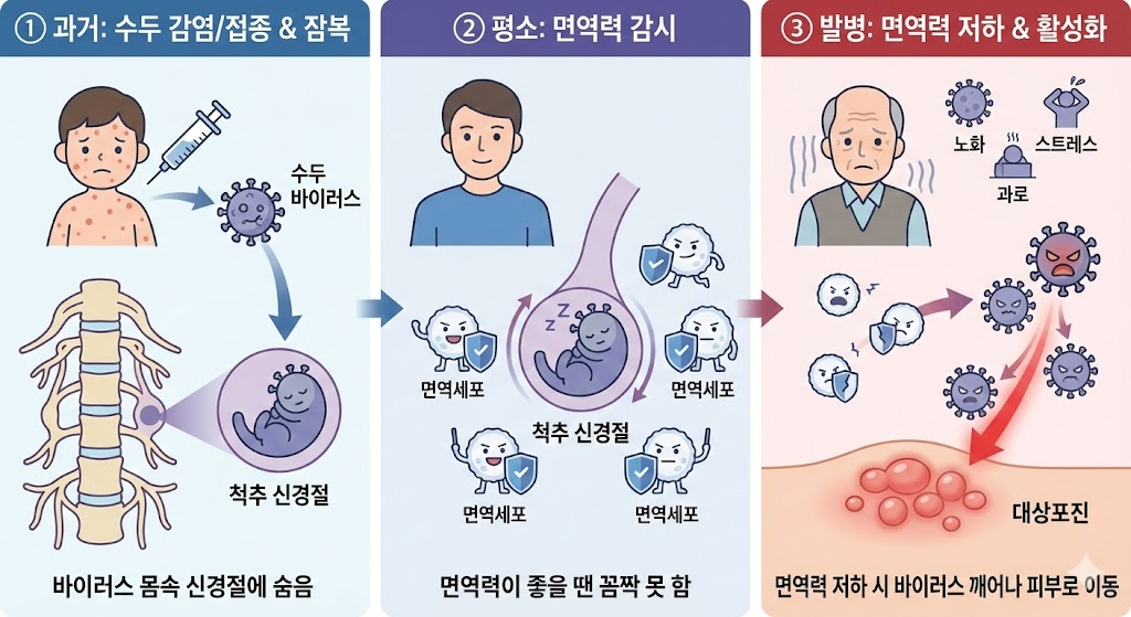 어릴 때 수두(Chickenpox)에 걸리신 적 있나요?, 혹은 수두 예방접종을 맞으셨나요? 그렇다면 여러분의 몸속 척추 신경절(신경 뿌리) 어딘가에는 수두 바이러스가 죽지 않고 잠복해 있습니다, 평소 면역력이 좋을 때는 면역세포들이 감시하고 있어서 꼼짝 못 하다가, 나이가 들거나, 과로, 스트레스, 항암치료 등으로 면역력이 뚝 떨어지는 순간! 이 바이러스가 잠에서 깨어나 신경을 타고 피부 표면으로 올라옵니다, 이것이 바로 대상포진인 거죠!