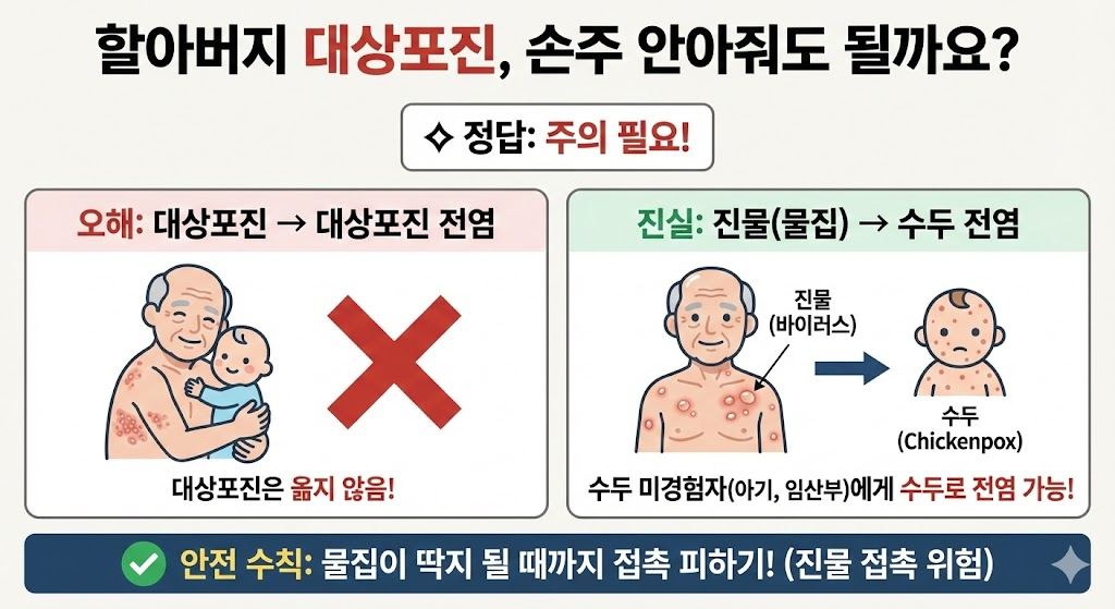 가장 많이들 궁금해하시는 겁니다, 할머니, "할아버지가 대상포진이 걸리셨는데 손주를 안아줘도 될까요?"
