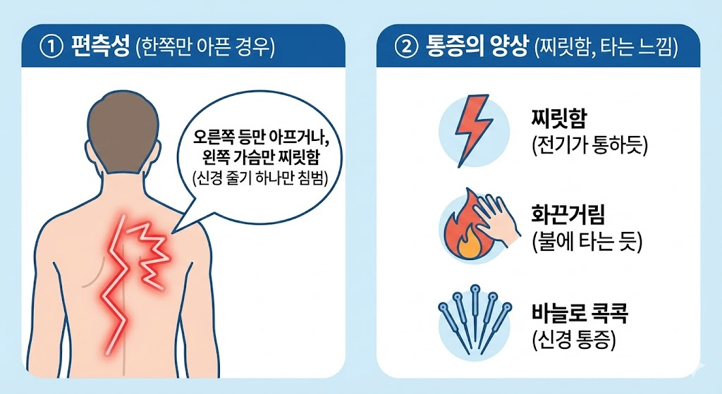 - 근육통처럼 묵직한 게 아니라, 전기가 통하듯 찌릿하거나, 불에 타는 듯 화끈거리고, 바늘로 콕콕 찌르는 듯한 신경 통증이 특징입니다.